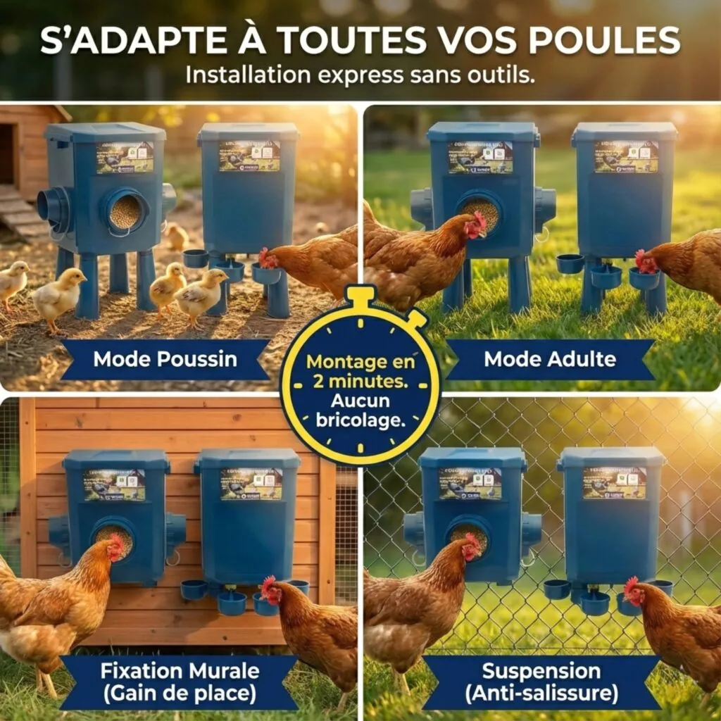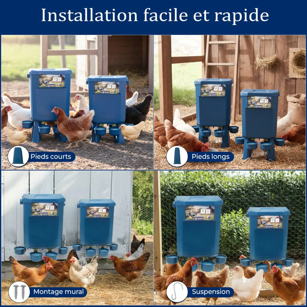 12 kg de nourriture + 11 L d’eau : autonomie adaptée pour 10 à 15 poules, avec 4 modes d’installation (pieds courts, pieds longs, fixation murale, suspension).