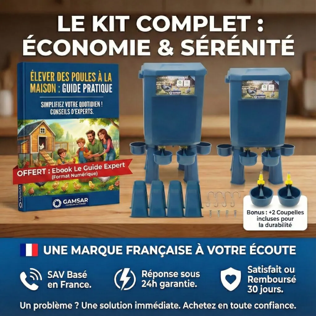 L’eau s’écoule uniquement quand les poules boivent : zéro flaque, zéro stagnation. Coupelles robustes, nettoyage facile, sol plus propre.