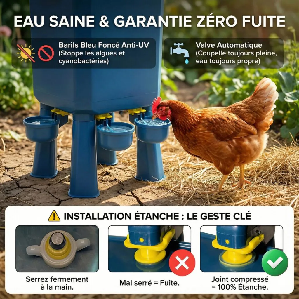 Valve automatique : eau à la demande (zéro flaque, zéro stagnation). Capot anti-pluie côté mangeoire + ports anti-nuisibles pour limiter pertes et intrusions.