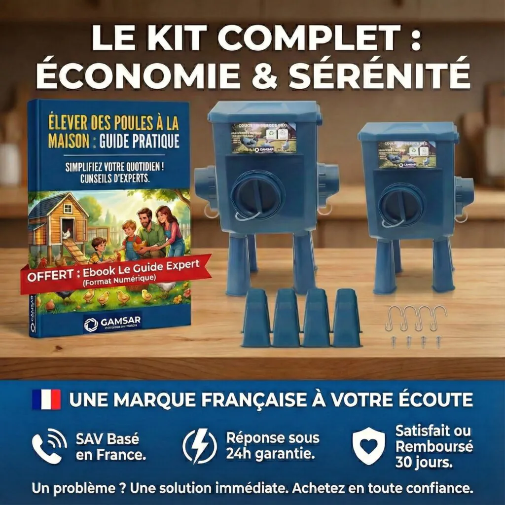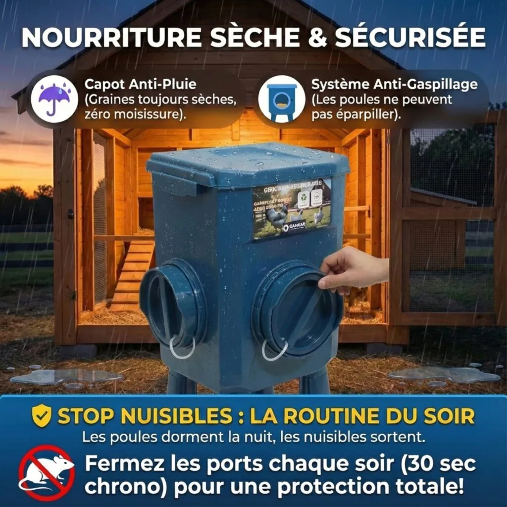 Ports anti-gaspillage + capots anti-pluie : grains secs et protégés des rongeurs/oiseaux. Matériaux résistants (UV, chocs, intempéries) + Ebook offert et 30 jours satisfait ou remboursé.